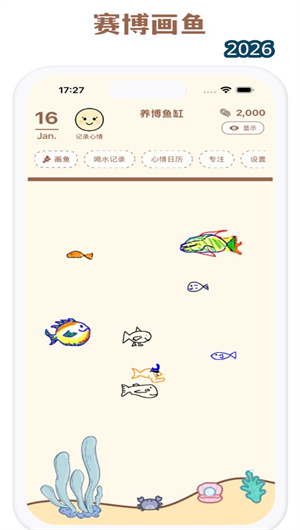 赛博画鱼App最具特色的设计在于其建立的情感纽带。用户投入心血亲手绘制的每一条小鱼,都不是冰冷的贴图,而是被赋予了个性化名称、由用户健康习惯“喂养”长大的数字宠物。这种情感投射机制使得坚持健康习惯不再是为了抽象的数据,而是为了呵护自己创造的生命与景观。应用内设有小鱼成长日志,记录每条鱼从“鱼卵草图”到“成熟个体”的过程,以及期间用户为维持它所付出的每一次健康努力,将行为数据故事化,极大地提升了用户的留存意愿与情感投入。