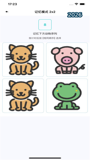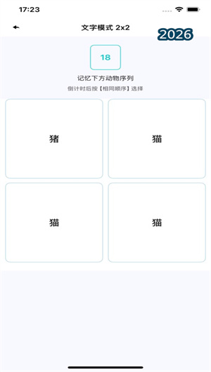 极乐园App提供两种截然不同但目标一致的训练模式。在经典的记忆模式下,系统会在限定时间内展示一组由不同动物卡片按特定顺序排列的视觉序列,倒计时结束后,玩家需在空白方格矩阵中,严格按照原始顺序点击对应的动物图标进行复原。而在更具挑战性的文字模式下,系统展示的将是一组动物名称的文字序列,玩家需要根据文字描述的记忆,在图形化的方格中选择对应的动物图像进行排列。两种模式共享同一套动态难度调控系统,会根据玩家表现智能调整序列长度、展示时长及动物图标相似度,形成个性化的记忆力进阶路径。