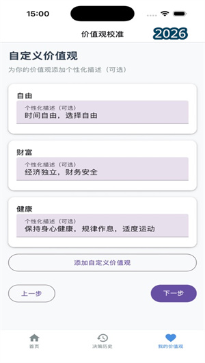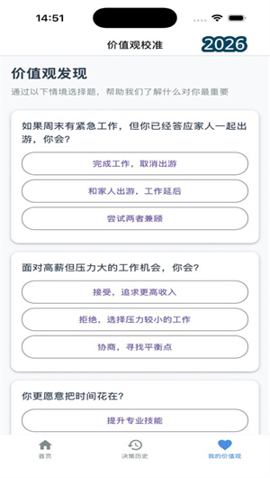 用户可通过两种核心路径进行价值观梳理:一是完成应用设计的情境选择题库,在面对虚构但典型的人生情境选择中,逐步明晰自己的价值排序;二是通过 “事件回忆法” ,记录过去对自己影响深远的真实事件,由系统引导分析该事件背后凸显的核心价值。基于这些输入,用户可以定义并命名自己的核心价值列表(如“家庭”、“创造”、“自由”),并为每一项分配自定义权重系数,形成一个动态的、量化的个人价值权重模型。系统支持设置定期回顾提醒,鼓励用户随着人生阶段变化重新审视和调整这个模型。