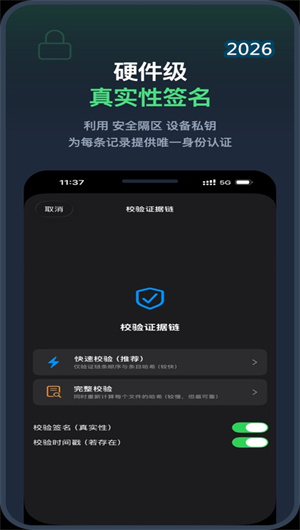 验迹APP的核心基础功能是硬件级真实性签名。该功能调用移动设备内置的安全隔区(Secure Enclave) 这一物理隔离的安全协处理器,生成并存储一个设备唯一私钥。当用户对照片、视频或录音文件进行存证时,应用会利用该私钥对文件的数字指纹(哈希值) 进行签名,生成一个独一无二的 “数字水印”——硬件级数字签名。该签名与特定设备硬件深度绑定,从物理层面杜绝了文件在生成后被从其他设备或软件伪造的可能性,完美实现了对数据来源真实性与创建主体的强关联认证,为后续可能的司法鉴定提供了设备溯源的铁证。