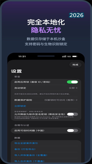 验迹坚守极致隐私保护原则,整个存证过程实现全本地化运行。所有原始文件、签名数据、哈希链及时间戳凭证均加密存储于应用的安全沙盒容器内,与系统其他区域隔离,绝不自动上传至任何云端服务器。应用启动时,内置的运行时主动防御机制会立即检测设备是否存在越狱(Jailbreak)、调试(Debug) 或代码注入等安全风险,一旦发现威胁即限制敏感功能使用,确保证据管理环境纯净。用户还可启用面容ID、触控ID或应用锁,为整个应用增加额外的生物识别或密码访问屏障。