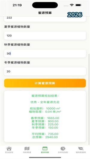 为确保传粉昆虫全年获得稳定食物供给,应用的季节性蜜源预算规划器至关重要。用户首先设定规划区域的面积,然后分别针对春、夏、秋、冬四季,规划种植的蜜源植物种类与数量。系统会调用内置的植物物候与泌蜜量数据库,自动计算该配置下的总蜜源预算(以能量或资源单位表示)和植物种植密度,并评估其是否满足目标传粉昆虫群落的季节性需求波动。同时,规划器会提供科学的种植配置建议,例如增加早春或晚秋的开花植物以填补蜜源空缺,实现真正的可持续支持。