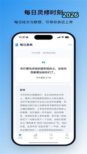 「每日恩典」内置强大的「随身宝典」——一个高效、精准的「圣经搜索引擎」。用户不仅可以通过关键词、人名、地名快速定位经文,更能使用「主题查经」功能,围绕特定的生活议题(如“忧虑”、“喜乐”、“婚姻”)查找相关的系列经文与注释。软件支持多版本圣经对照(如和合本、新译本、NIV等),并提供「经文批注」与「高亮标记」功能,方便用户记录读经亮光。特别设计的「经文集锦」功能允许用户将相关经文打包收藏,形成自定义的「主题经文库」,用于日常默想或小组分享。