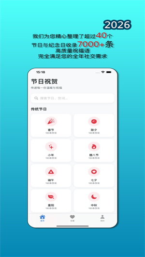 节日贺词大全是一款专注于汇集与呈现高品质祝福文案的手机应用,旨在帮助用户在每一个重要时刻都能便捷、准确地传递最真挚的心意。应用精选海量节日祝福语,构建了一个覆盖全年各类场景的智能文案库,无论是春节、中秋等传统佳节,还是生日、升职等日常祝贺,用户都能在这里找到恰到好处的表达。我们秉持“让每一次问候都充满温度”的理念,通过纯净无干扰的设计、严格保护隐私的架构以及简单直接的商业模式,致力于成为广大用户信赖的贴心祝福助手,开启温暖传递的数字之旅。