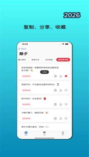 应用极度注重操作的人性化与便捷性,其「一键分享」功能设计流畅高效。用户浏览到心仪的祝福文案后,可通过直观的「复制按钮」一键将内容复制至剪贴板,或通过集成的「社交平台分享接口」直接跳转至微信、QQ、微博等常用应用进行发送。整个「分享操作流」经过深度优化,步骤简洁,响应迅速,有效避免了因复杂操作而中断的情感传递过程。此外,「会员用户」可享受「无限复制权益」,不受任何次数限制,而所有用户的基础分享功能均完全免费,确保了祝福传递过程的顺畅无阻。
