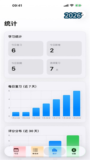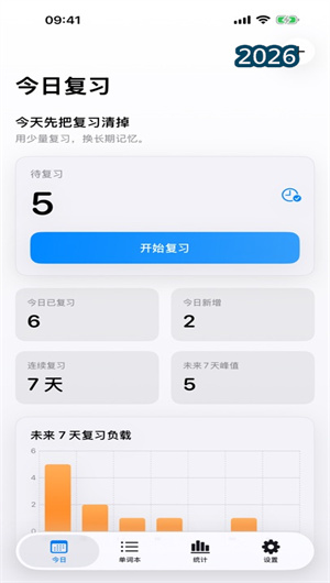应用的灵魂在于其“科学复习”系统,它完整植入了FSRS(自适应间隔重复系统)算法。该算法不同于传统的固定间隔复习,它通过分析用户每次复习时的“记忆稳定性”和“记忆难度”数据,为每个单词动态计算下一个最优复习时间点。系统每日生成智能的“今日复习”任务列表,并贴心地提供“快速复习”模式,供用户在碎片时间进行巩固。用户可灵活设置每日新学词量和复习强度参数,FSRS核心调度器会据此自动平衡“未来负载”,确保学习计划既具挑战性又可持续,从根本上提升记忆留存率至传统方法的2.5倍。