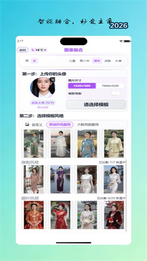 图形融合功能专为人像创意设计,它通过智能人脸检测与定位算法,精准识别用户上传照片的面部特征点与角度。用户可从丰富的艺术模板库中选择场景,系统随即启动人脸特征对齐与肤色光照调和流程,将用户肖像与模板进行自然融合,并完美保持原表情和神态。该功能支持自定义背景替换,其核心的纹理合成引擎与边缘羽化算法确保了合成边界的柔和过渡,使最终作品宛如一体生成,极大降低了专业级艺术照的制作门槛。