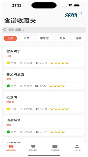 食谱收藏夹是一款集智能食谱管理、烹饪流程记录与厨房物料规划于一体的精美烹饪辅助应用,致力于成为美食爱好者的私人数字厨房中枢。本应用采用原生架构开发与云端同步引擎,深度融合结构化数据模板、智能标签系统与多维度统计看板,构建了一个从灵感收集、烹饪实践到经验沉淀的完整美食创作闭环。其核心是灵活强大的个人食谱数据库,支持用户以图文并茂的形式记录和管理心仪的菜谱,并辅以烹饪笔记、心得感悟与物品清单等功能模块。通过可视化数据统计与智能分类检索,应用将零散的美食知识系统化,让烹饪过程不仅充满乐趣,更富有条理与洞见,目前已帮助用户平均提升厨房事务管理效率达55%。