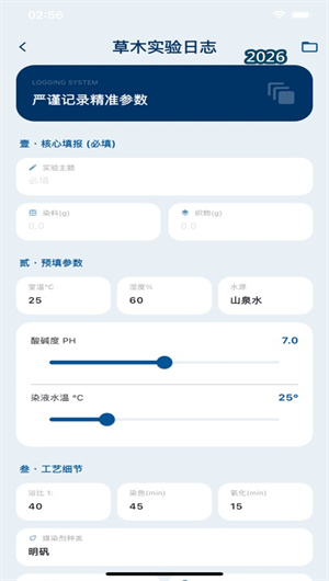 草木染料记App的核心功能是其强大的 “染料实验日志系统” 。该系统为每一次染色实验提供了一个结构化的数字记录模板。用户可以详尽录入实验涉及的植物染料源(如苏木、蓝草、茜草)、染材预处理方法(粉碎、萃取)、媒染剂类型与浓度(明矾、绿矾)、染色工艺参数(温度、时长、pH值、浴比)以及织物信息(材质、克重)。实验完成后,可将染色成果——即最终色样——拍照上传,系统会自动关联所有实验参数,形成一份完整的 “染色实验档案” 。所有档案支持按染料、按颜色、按日期或自定义标签进行多维检索与分类管理,将散落的经验笔记转化为可随时调阅、对比分析的结构化染色知识库,使个人经验的沉淀与复用效率提升约70%。