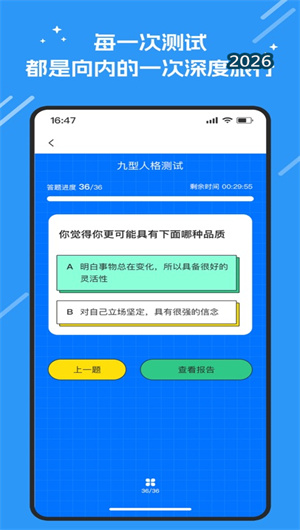 1. 趣味化答题与科学模型分析的深度融合,是心航罗盘最吸引用户的体验特色。平台彻底打破了传统心理测试枯燥、冗长的刻板印象,将每一个测评都设计为沉浸式的互动体验。通过情境化故事导入、视觉化选项呈现、即时性反馈设计等多种趣味元素,心航罗盘让用户在不知不觉中完成深度自我探索。例如,在测评外倾性维度时,系统不是直接询问“你是否喜欢社交”,而是通过一个周末聚会的虚拟场景,让用户选择自己最自然的应对方式;在评估情绪调节模式时,则会通过生动的情绪卡片排序游戏,让用户在趣味互动中暴露真实偏好。这种游戏化的测评设计,不仅大幅提升了用户完成测评的意愿与耐心,更有效降低了社会赞许性偏差对测试结果的影响,让心航罗盘的测评结论更加贴近用户的真实内心。据统计,心航罗盘用户的测评完整率达到94%,远超传统心理测试的平均水平。
