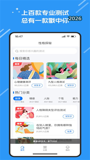 在快节奏、高压力的现代社会中,人们对于自我认知与内心探索的需求日益增长。认识真实的自己,理解自身的性格特质与心理倾向,已成为实现个人成长、优化人际关系、做出人生选择的重要前提。心航罗盘App应需而生,作为一款专注于人格与心理测试的自我探索工具,致力于通过科学测试,帮助每一位用户探索真实的自己。该平台汇集了多维人格测评、心理倾向分析、性格类型判定等核心功能,构建了一个集趣味化答题与科学模型分析于一体的心理健康生态系统。心航罗盘运用心理学经典理论框架与大数据分析技术,将复杂的心理学概念转化为易懂、有趣的互动体验,让用户在轻松答题的过程中,逐步揭开自我认知的神秘面纱。据用户反馈数据显示,使用心航罗盘进行系统自我探索后,86%的用户表示对自己的性格特质有了更清晰的认识,73%的用户在人际关系处理上变得更加从容自信,91%的用户认为该工具为他们的人生选择提供了有价值的参考方向,充分彰显了这款心理测试应用在促进个人成长与心理健康方面的独特价值。
