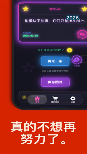 综上所述,摆烂许可证App以其独特的文化洞察、温暖的情感支持、创新的功能设计,重新定义了情绪减压工具的标准,是每一个在快节奏生活中感到疲惫的灵魂最温柔的陪伴者。它告诉我们:在这个永远要求努力的世界里,偶尔停下不是失败,而是对自己的尊重与关怀。今天,你也可以领取一张摆烂许可证,安心地告诉自己——可以停一下。