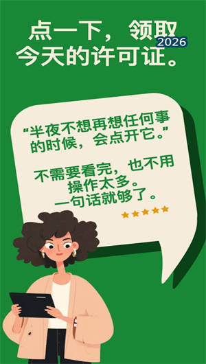 1. “不解释、不评判”的产品哲学贯穿始终,是摆烂许可证最鲜明的情感特色。在每一个设计细节中,这款应用都坚持着对用户情绪的完全接纳——不追问原因、不给建议、不做价值判断。当用户领取许可证时,系统不会弹出“你为什么会感到疲惫”的追问,也不会推送“你应该这样调节情绪”的说教,更不会对用户的“摆烂”行为进行任何形式的评判或分析。这种彻底的接纳态度,在这个充满指导、建议、要求的时代显得尤为珍贵。摆烂许可证深刻地理解到,很多时候人们需要的不是又一个解决方案,而是一个可以安全地承认“我现在就是不行”的空间。正是这种“不解释、不评判”的纯粹陪伴,让摆烂许可证成为用户心中最温暖、最无压力的心灵庇护所,让每一次使用都像是一次被完全接纳的疗愈体验。