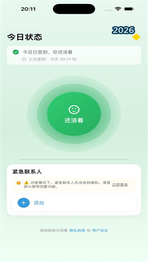 1. 每日签到与自动守护机制是活着呗的核心功能,它以极简的交互为用户提供最基础的安全确认。用户每天只需在主界面点击醒目的「我还在」按钮,即可完成当日签到,系统会记录签到时间并更新安全状态。对于生活规律的用户,活着呗还贴心地提供了自动签到功能——用户可以设定每日的签到时间窗口,系统在检测到手机正常使用行为(如解锁屏幕、步数变化等)后,可自动完成签到确认,让守护更加无感、更加简单。这种每日签到的设计,既不会给用户带来额外的负担,又能让远方的家人朋友安心——只要看到签到记录持续更新,就知道对方一切安好。活着呗的签到机制将原本需要主动询问、反复确认的关心,转化为一个简单而温暖的习惯动作,让守护变得轻松而自然。