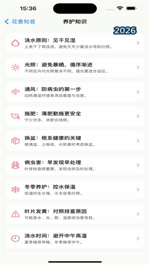 2. 养护知识库与专业园艺指南的持续更新,是花卉图鉴赋能用户自主学习的知识亮点。平台与多位园艺专家、植物学研究者建立合作关系,持续生产高质量的原创内容。养护知识库不仅涵盖基础养护技巧,更深入探讨植物生理机制、病虫害防治原理、环境调控策略等进阶主题,满足不同层次用户的学习需求。花卉图鉴还特别推出了“季节养护指南”系列,根据春夏秋冬不同季节的气候特点与植物生长规律,提供针对性养护建议与当月必做事项清单,帮助用户提前规划、从容应对。所有知识内容都经过专业审核,确保科学准确,同时又以通俗易懂的语言呈现,让复杂的植物学知识变得亲切可及,真正实现了“让养花更轻松、更专业”的产品承诺。