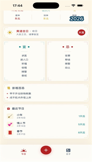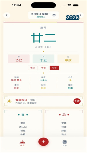 在快节奏的现代生活中,古老的智慧依然在悄然指引着我们——搬家要挑个黄道吉日,婚嫁要避开冲煞,开业要选个纳财的好时辰。然而,传统的黄历书籍厚重难懂,网络上的信息又零散杂乱。看日子APP正是为解决这一需求而生,它是一款融合中国传统黄历文化与现代设计的日历应用,让你随时掌握每日宜忌,不错过每一个重要日子。从干支纪年到建除十二神,从二十八宿到彭祖百忌,看日子将千年的择日智慧浓缩于方寸屏幕之间,以优雅的国风设计和直观的交互体验,让传统历法变得一目了然。无论是公历农历同步显示,还是传统节日、二十四节气的精准标注,看日子都力求做到中西合璧、古今交融。更贴心的是,你可以在这里记录人生中的每一个珍贵时刻——纪念日、生日、考试、工作节点,智能倒计时提醒,让温暖永不缺席。下载看日子,让每一天都有好兆头。