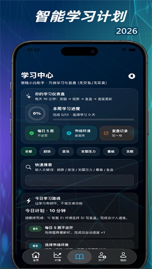 在金融交易的世界里,大多数人急于寻找“圣杯”——那个能预测市场的神奇指标或万能策略。然而,真正的赢家深知,稳定的市场认知和持续的复盘习惯,远比任何短期技巧更重要。荣顺策略学习助手正是为此而生,它是一款专注于市场认知与交易思维训练的学习型应用,帮助用户建立结构化的观察能力与复盘习惯。这里不提供任何交易功能或买卖建议,只有纯粹的学习与训练。从基础概念到实战思维,荣顺策略设计了清晰简洁的学习路径,让你每天只需几分钟,就能持续提升对市场结构、量能与位置的理解能力。通过市场环境学习、每日答题训练、复盘记录和技能成长面板,你将亲眼见证自己的进步。荣顺策略相信,稳定的认知体系,才是长期稳健的基石。