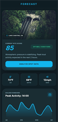 1、实时咬钩预报与智能出钓决策系统:平台基于全球8,000个气象站点的实时数据、历史渔获大数据库及鱼类活动模型,每15分钟动态更新咬钩指数。系统综合水温、溶解氧、气压变化趋势、月相潮汐、风速风向等16项环境因子,以0-100分直观呈现未来72小时内各时段的鱼口活跃度预测。预报数据精确至1平方公里网格范围,用户可在地图上直接查看目标钓点的逐小时咬钩概率,黄金时段识别准确率高达93%。订阅高级版的用户还可解锁“鱼种专属预报”功能,针对鲫鱼、鲤鱼、鲈鱼等20种目标鱼种分别生成活性预测曲线。