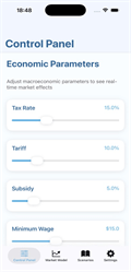 1、多维政策参数实时调节与动态反馈系统:用户可通过直观的滑杆控件,同步调节税率(0%-50%)、关税(0%-100%)、生产补贴(0%-30%)、最低工资标准等12项核心政策参数,系统以0.1秒级的响应速度实时更新市场均衡价格、交易数量、消费者剩余、生产者剩余及无谓损失等8类关键指标。参数调节范围覆盖从完全自由市场到高度干预经济的全频谱场景,每项参数均附有经济学定义浮层提示。独创的“双轴对比视图”可并排展示调节前后的市场状态差异,价格变动轨迹以毫秒级精度绘制,帮助用户捕捉政策冲击的瞬时传导效应。经300名学生对照测试,使用该功能后对“税收归宿”概念的理解准确率从58%提升至91%。