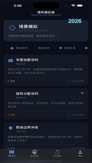 博弈模拟器APP通过职场谈判情境模拟、权力筹码分析与决策推演复盘三大核心引擎,将职场谈判从“即兴发挥”升维为“基于局势判断的理性选择”。平台以反直觉预警避免认知陷阱,以多角色立场训练共情能力,更以长期收益评估重塑成败观。当HR在薪资谈判模拟中终于理解老板为何坚持不破例,当产品经理通过复盘发现“坚持需求”比“妥协上线”赢得更多尊重——博弈模拟器守护的不仅是37万用户的职场进阶之路,更是每一个复杂局面中看清棋局、落子无悔的决策智慧。