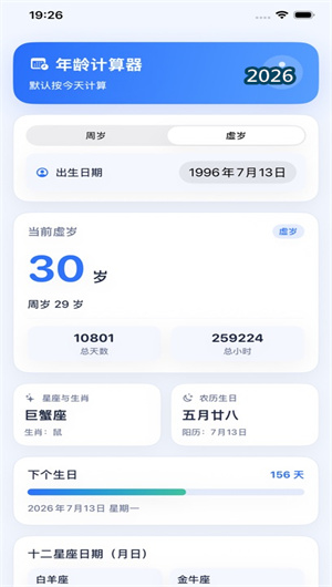 时间是我们最宝贵的资产,而年龄则是时间在我们生命旅程中留下的刻度。无论是需要精确计算法律意义上的法定年龄,还是想了解自己在传统文化中的虚岁几何,亦或是为家人朋友准备生日惊喜,一个精准、全面的年龄工具都不可或缺。“年龄计算器”APP正是为此而生。它是一款专注于年龄精准测算与生日管理的工具应用,致力于将复杂的历法转换、生肖星座计算化繁为简。无论您是想知道自己来到这个世界的精确总天数,还是想确认下一个农历生日的具体日期,只需输入出生日期,一切答案即刻呈现。本文将为您详细解读这款软件在历法计算、文化习俗以及情感提醒等方面的卓越表现。