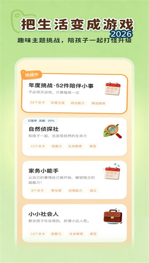 本应用坚信,了不起的从来不是那些“小事”本身,而是愿意花时间陪孩子哪怕只做一件小事的父母。每天只需5-10分钟,利用碎片时间完成一次有效连接,就能在日积月累中构建起深厚的亲子关系。从感官互动到逻辑启蒙,从户外探索到情商培养,了不起的小事将成长的关键节点拆解为一个个趣味盎然的陪伴任务,让父母不再为“怎么陪”而费脑。