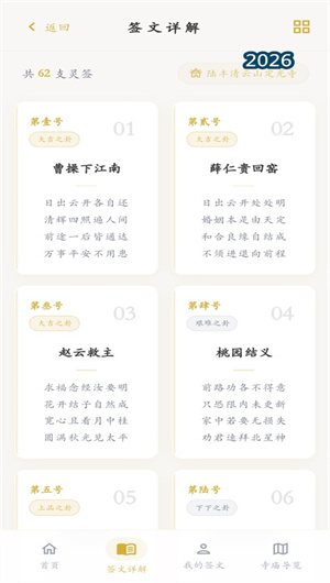 1. 完整的签诗浏览与签文解析系统:软件系统收录了青云山定光寺传承至今的六十二支签诗,每一支都配有详细的签文注解、吉凶推断和现代文释义。用户可以根据签序号或签诗标题,快速查阅到对应的签诗全文,包括签题、签诗正文、签序归属以及传统的解签断语。例如,对于抽得“上上签”的用户,系统会详细解读签文中蕴含的佛教智慧与人生启示,说明其对应的运势走向;而对于“下下签”,则会以积极正面的方式引导用户理解其中的警醒意义,提供趋吉避凶的建议。所有签诗的签文出处、历史典故和文学赏析都经过专业考据,确保每一支签诗的解读都忠实于青云山定光寺四百年来的宗教文化传统。