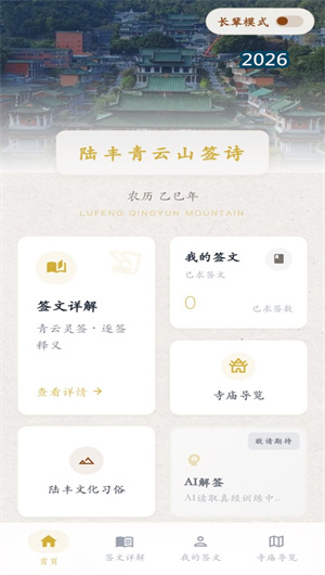 《青云山签诗》是一款致力于传承和普及陆丰青云山地区传统签诗文化的数字人文应用。它深度挖掘并完整收录了青云山定光寺传承四百年的六十二支珍贵签诗,每一支签诗都承载着深厚的历史文化底蕴和独特的文学价值,是岭南地区不可多得的宗教文化遗产。这款应用不仅仅是签文的数字化载体,更是一座移动的民俗博物馆,通过现代技术手段,将古老的抽签解签仪式、寺庙建筑艺术、地方民俗风情与佛教智慧融为一体。用户可以在方寸屏幕之间,感受青云山定光寺四百年的历史沿革,品味签诗中蕴含的处世哲理与人生启迪。无论是虔诚的香客,还是传统文化的爱好者,都能在这里找到心灵的慰藉与文化的滋养。我们希望通过这种数字化传承方式,让超过30个与青云山签诗文化相关的专业术语重新走入大众视野,让这份珍贵的非物质文化遗产在新时代焕发出新的生机与活力。