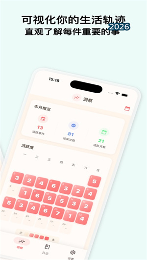 心记通过精美的热力图日历直观展示用户活跃度,生成事件趋势图了解习惯变化,提供事件排行榜看看最常做什么,配合详细的活跃度分析,让用户清晰了解自己的生活轨迹。