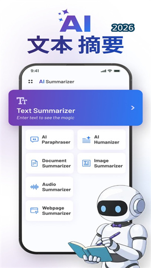 AI摘要是一款集成多功能的AI文本摘要与写作创作工具,通过AI摘要器引擎与文章生成器系统的双核驱动,帮助用户快速理解内容、整理重点,并结合写作AI能力提升阅读与写作效率。平台以“自然改写文本,专业呈现”为核心理念,支持文本、PDF、音频、网页等多种内容处理,融合ai写作助手、作文生成器、写作文神器等功能,满足学习、办公、创作多样化需求。目前累计陪伴用户超17万人,处理文本摘要470万篇,用户阅读效率平均提升63%,被用户称为“手机里的智能阅读写作助手”。