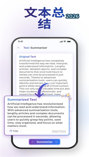 AI摘要APP通过AI文本摘要快速提炼、文档与PDF摘要处理、音频网页多源摘要三大核心引擎,将阅读写作从“耗时费力”升维为“智能提炼、高效创作”的数字体验。平台以写作AI多场景覆盖满足各类创作需求,以Zing Chat智能对话让写作更自然,更以OCR图文转换拓展应用边界。当学生用摘要快速看完十篇文献,当上班族用写作助手完成工作报告——AI摘要守护的不仅是470万篇摘要数据,更是每一个学习者、工作者、创作者高效阅读、轻松写作的数字日常。
