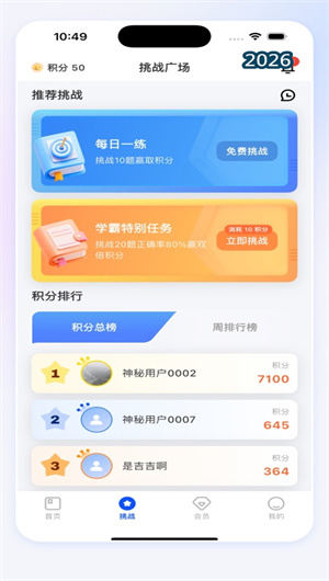 医路赢家设置挑战排行榜,用户可查看自己在好友、同城、全国考生中的排名。排行榜每日更新,激发社交竞争意识,增加学习动力。
