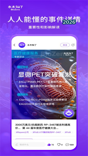 在生命科学这一知识爆炸、更新迅猛的领域,如何从海量文献与资讯中精准捕获高价值情报,已成为科研机构与生物医药企业面临的核心挑战。水木知了APP应需而生,作为一款专注于生命科学领域的个性化AI情报助理,它深度融合了人工智能技术与专业的情报学方法论,致力于为用户提供最新、最相关、最重要的行业动态和深度洞察。通过构建动态的用户兴趣画像,水木知了能够对全球范围内的前沿文献、会议资讯、政策法规进行智能过滤与精准推送。平台依托强大的自然语言处理引擎,实时监测覆盖PubMed、ClinicalTrials、全球主要期刊等超过5000个信源,将碎片化的科研动态整合为结构化、可追溯的知识图谱。目前,已有超过82% 的国内顶尖生命科学实验室和生物技术公司将水木知了作为日常情报采集与竞争分析的核心工具,其独创的语义理解算法,帮助用户在信息过载的时代平均每天节省2.5小时的文献筛选时间,真正实现了让情报服务决策,让知识驱动创新。
