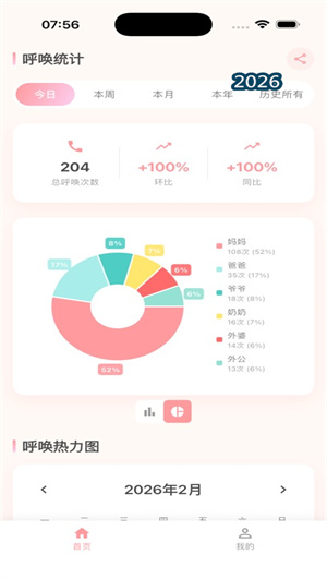 3. 含妈量的图表统计与热力图功能是其长期情感追踪的重要工具。趋势分析模块以折线图展示日、周、月、年维度的呼唤次数变化,让用户清晰看到孩子对每位家人的情感依赖随时间如何演变——也许妈妈产假结束上班后“含妈量”短暂下降,也许爸爸出差归来后“含爸量”突然飙升。热力图以日历形式展示每天的被呼唤情况,颜色深浅代表次数多少,一年下来形成独特的情感图谱,哪些天宝宝特别需要陪伴、哪些阶段情感表达更频繁,一目了然。角色对比功能将不同家庭成员的被呼唤数据叠加展示,直观呈现谁在哪个阶段更受青睐。成长曲线预测基于历史数据,预估未来一段时间的情感依赖趋势,帮助父母提前规划陪伴时间。数据导出功能支持将统计报告导出为图片或PDF,方便保存或分享给家人,共同回顾成长轨迹。这些可视化工具让原本无形的亲情变得可看、可感、可回忆。