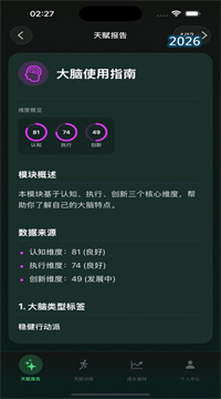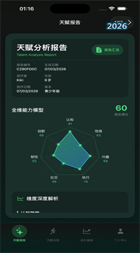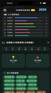 2. 7 大维度全面画像:天赋探索 App 提供7 大维度全方位能力解析,覆盖认知能力、性格特质、兴趣倾向、执行功能、社交能力、心理韧性、创新思维,细分逻辑推理、空间想象、开放性、尽责性、计划力、自控力、共情力、领导力、情绪稳定性、创造力等 68 项精细指标,系统自动拆解数据、量化评分、生成解读,让家长与孩子清晰看到优势与短板,实现能力评估无死角、无遗漏。