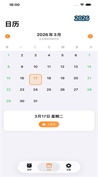 2、日历左右滑就能看全年假期,红色假期灰色补班一眼分清,下个月有没有长假一秒知道,提前安排旅游不用翻黄历。