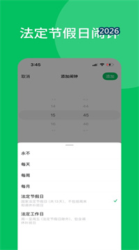 2、调休工作日智能提醒确保你不会因为补班而迟到,系统会自动识别并恢复闹钟响铃。