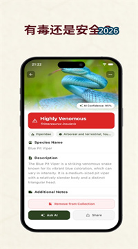 《蛇类识别》是一款能在几秒内告诉你面前那条蛇有没有毒的AI拍照识别软件。