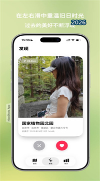 3、左右划进入发现模式,系统随机挑出旧照,全屏播放当年快门声,顺便显示当时天气。