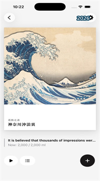 1、画布从零开始,随着你每一口水的摄入,经典浮世绘色层逐层浮现,直到完整画面解锁,过程像做版画一样过瘾。