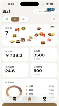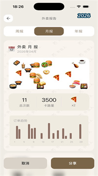 3、提供详细的周、月、年报告,帮你从多个角度分析外卖数据,掌握自己长期的饮食变化和趋势。