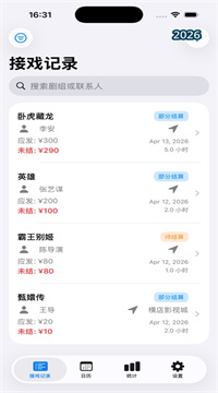 2、自动生成详细的接戏台账,清楚汇总你的所有工作记录,让你对自己的演出收入一目了然。