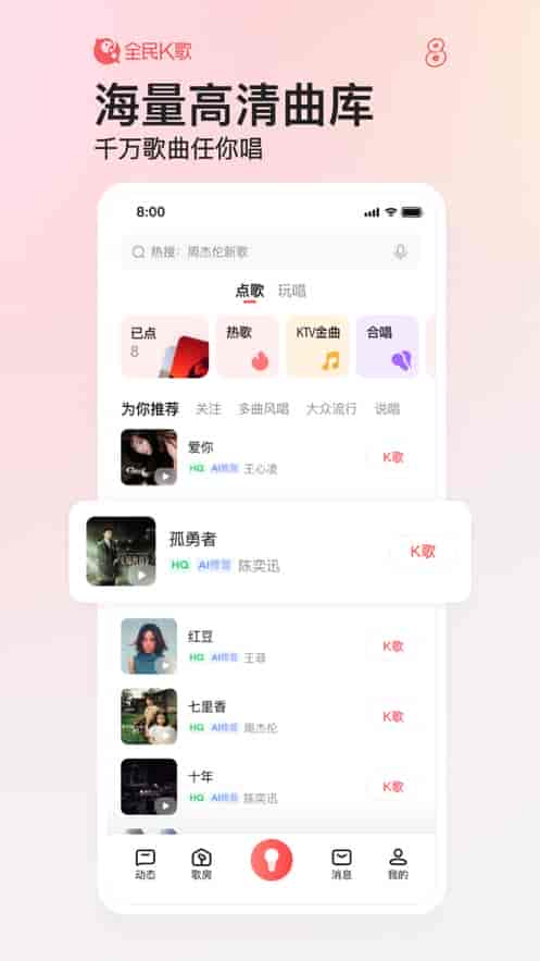 1、建立一个新的k歌社区,用声音记录你的生活。图形和语音使分享更加生动。大量音乐满足您的各种风格。强大的声音效果和一键修复功能给您录音室般的k歌!